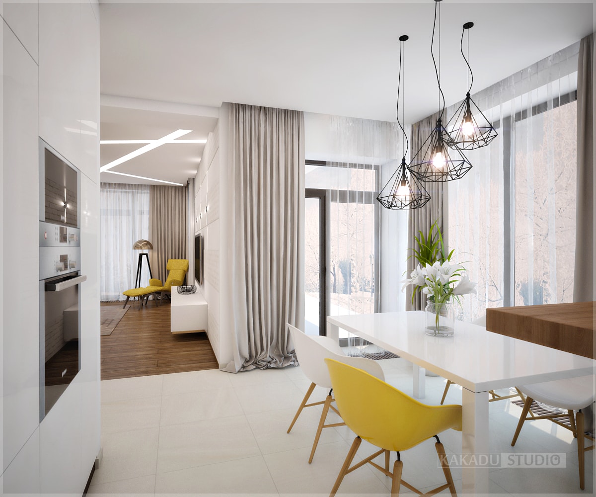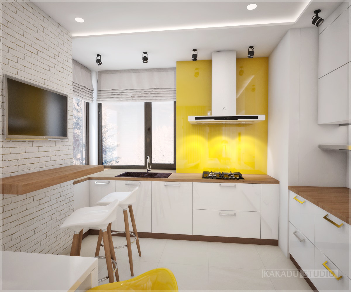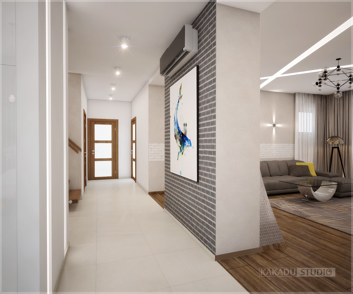 Желанием хозяина дома было создать интерьер современный и в то же время удобный для жизни. Помещения дома по плану довольно просторные и светлые, нам хотелось оставить их такими — не утяжелить и не загромоздить. Было решено общий тон помещений оставить светлым, но дополнить акцентными деталями. В кухне акцентной стала жёлтая рабочая стена, при нейтральности всего остального в интерьере это смотрится стильно и свежо. В гостиной акцентом стал камин и потолок. Камину была придана экстравагантная форма, облицовка мозаикой также не обычное решение. Салатовый цветовой акцент в спальне придаёт свежести, конструкция зрительно выделяет кровать, использование 3D панелей привносит разнообразие в отделку помещения. Ванная выполнена в белых тонах, глянцевая плитка добавляет объёма помещению.