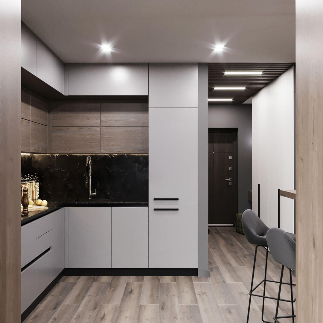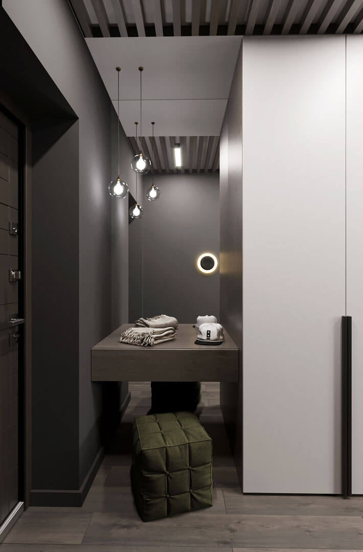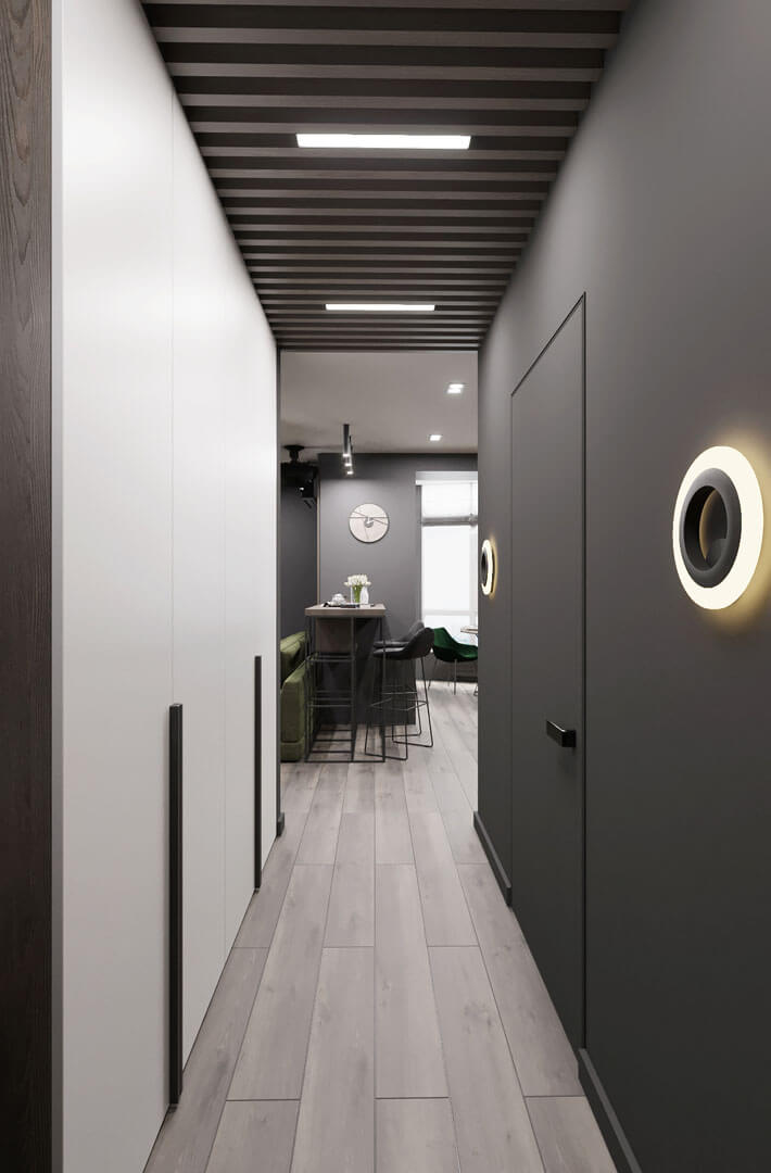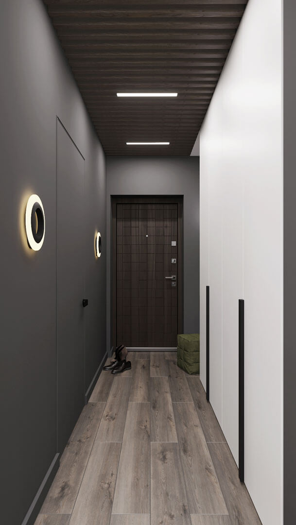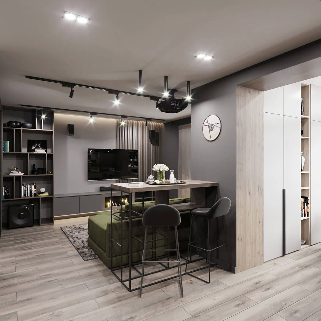 Квартира розроблялася для молодої людини, яка поки що збиралася жити самостійно. Колірна гама інтер’єру та оздоблювальні матеріали – суворі та брутальні, витримані в одній кольоровій гамі. Освітлення використано різноманітне, переважно у “лофт” стилістиці. За рахунок різноманітного освітлення приміщення виглядають просторо та не перевантажено. Зона спальні відокремлена скляною перегородкою, що особливо актуально у сучасному інтер’єрі.