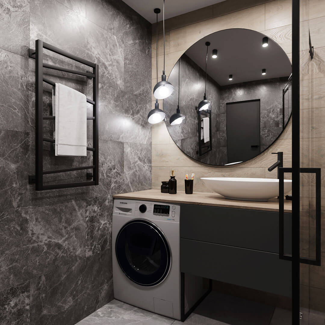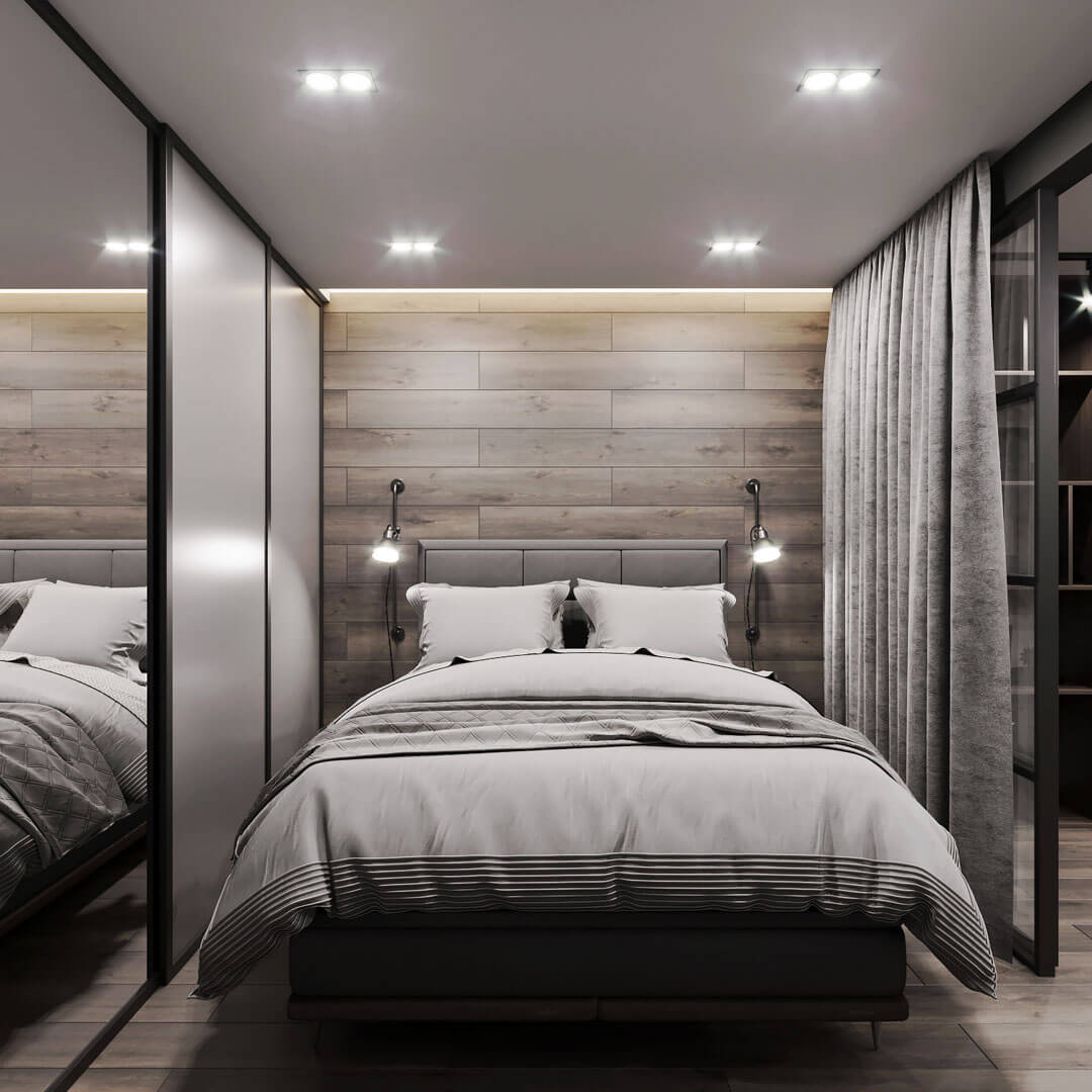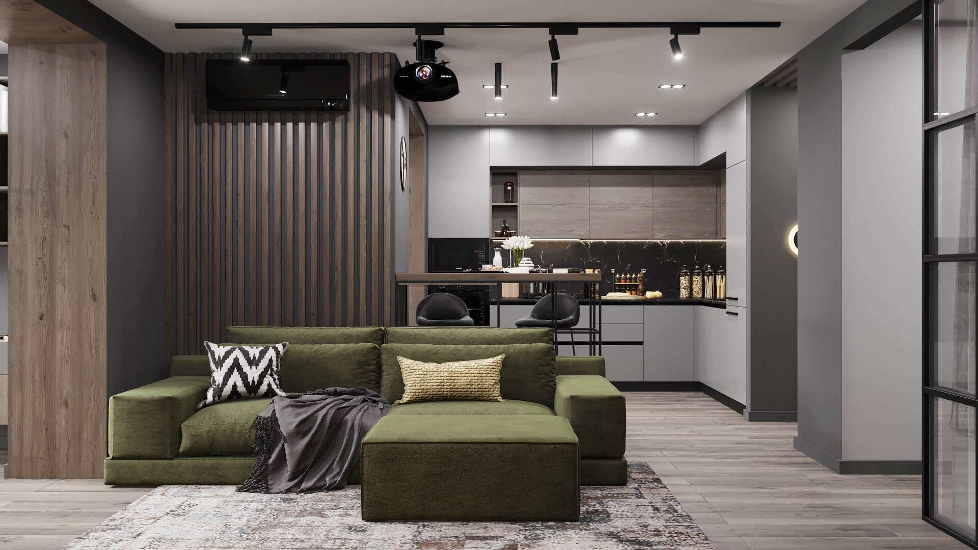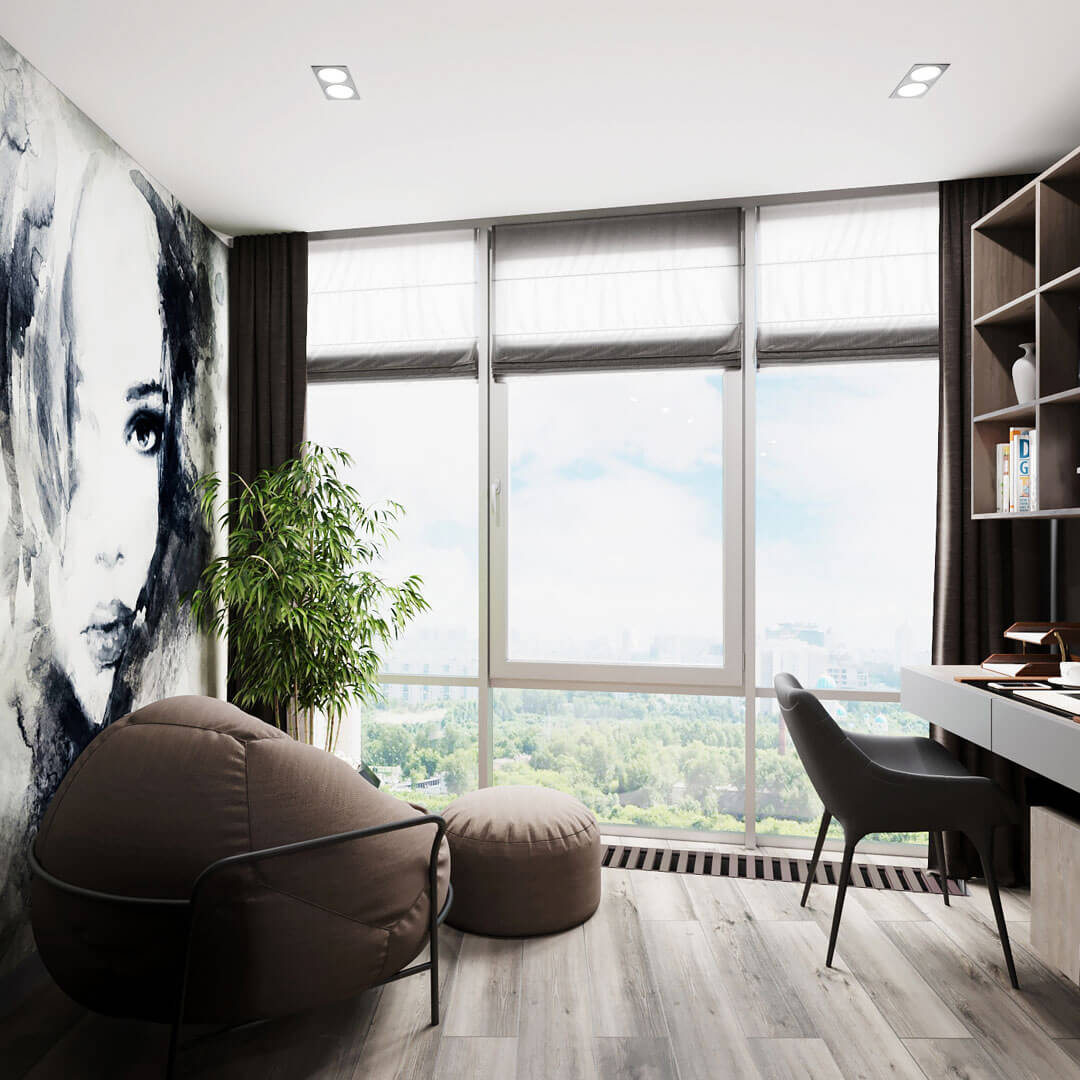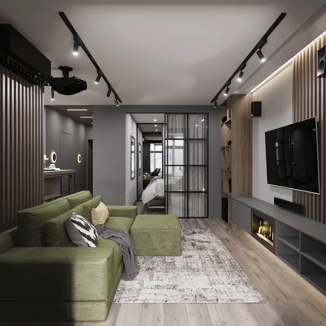 Квартира розроблялася для молодої людини, яка поки що збиралася жити самостійно. Колірна гама інтер’єру та оздоблювальні матеріали – суворі та брутальні, витримані в одній кольоровій гамі. Освітлення використано різноманітне, переважно у “лофт” стилістиці. За рахунок різноманітного освітлення приміщення виглядають просторо та не перевантажено. Зона спальні відокремлена скляною перегородкою, що особливо актуально у сучасному інтер’єрі.