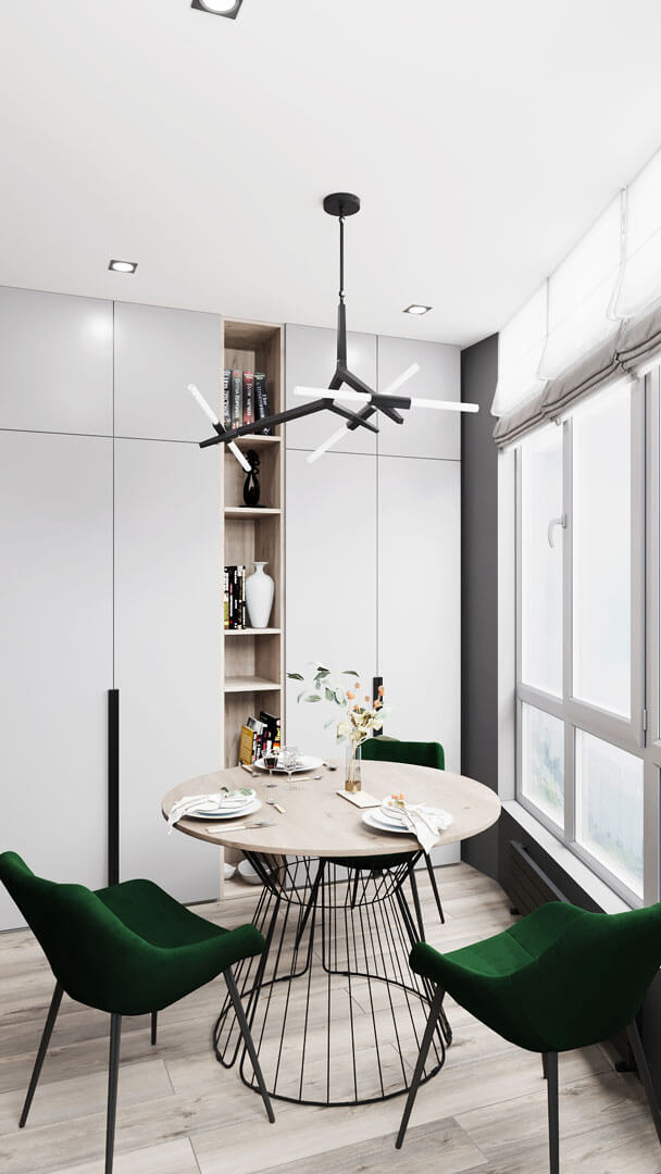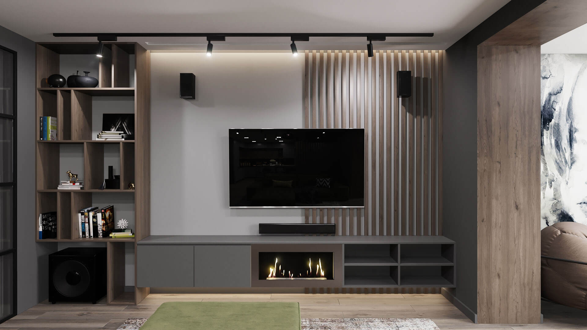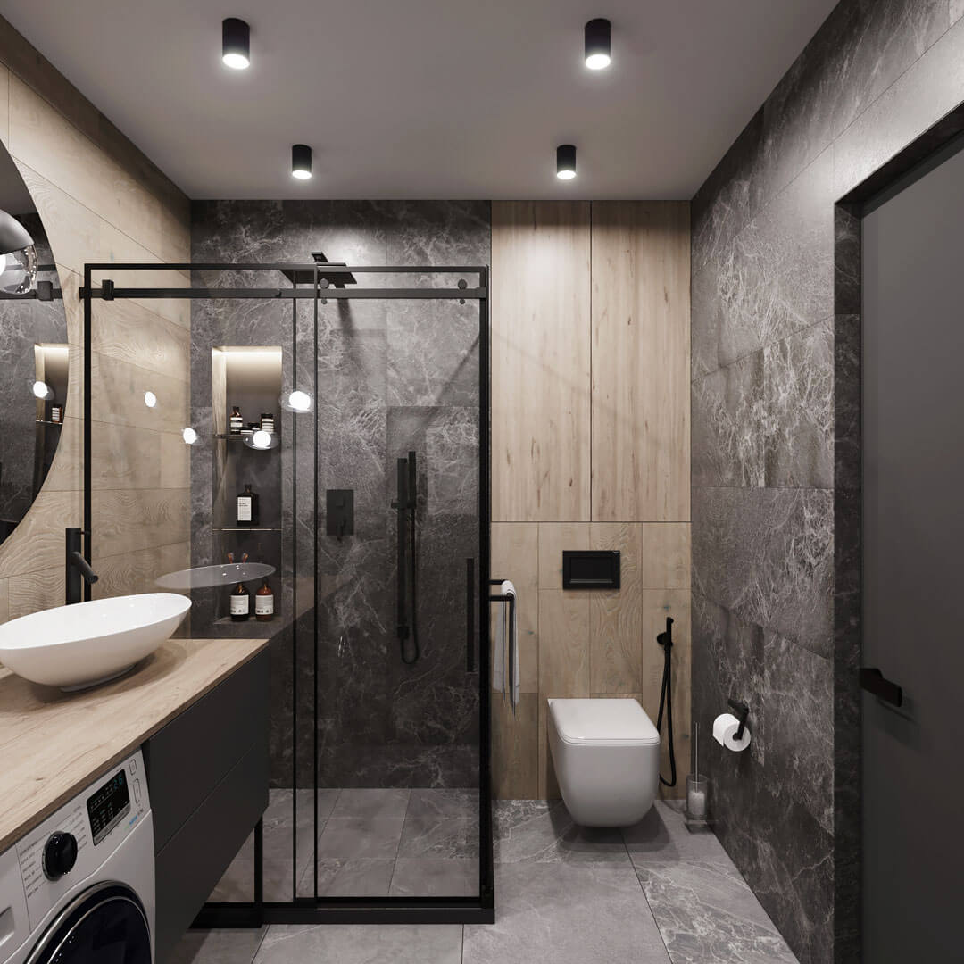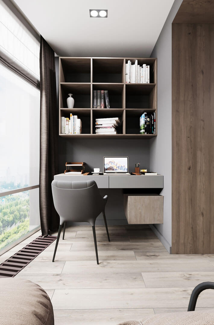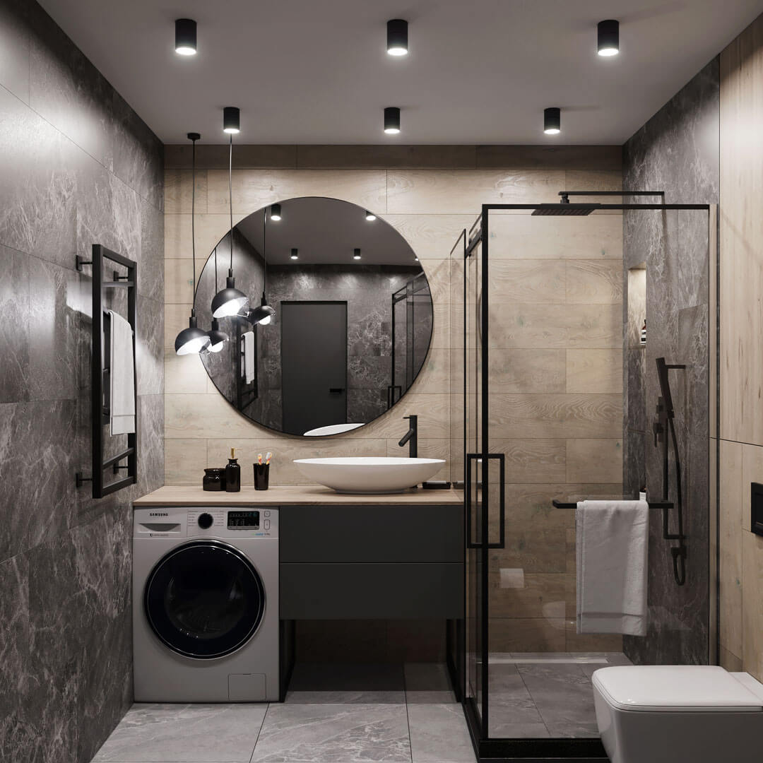 Квартира розроблялася для молодої людини, яка поки що збиралася жити самостійно. Колірна гама інтер’єру та оздоблювальні матеріали – суворі та брутальні, витримані в одній кольоровій гамі. Освітлення використано різноманітне, переважно у “лофт” стилістиці. За рахунок різноманітного освітлення приміщення виглядають просторо та не перевантажено. Зона спальні відокремлена скляною перегородкою, що особливо актуально у сучасному інтер’єрі.