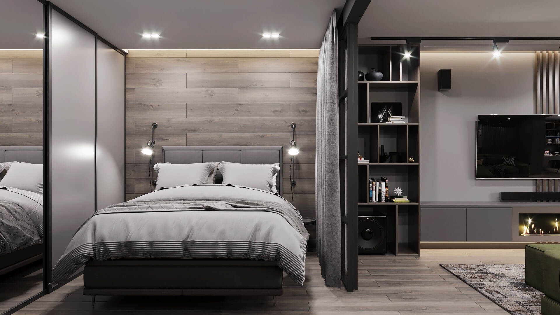 Квартира разрабатывалась для молодого человека, который пока собирался жить самостоятельно. Цветовая гамма интерьера и отделочные материалы — строгие и брутальные, выдержанные в одной цветовой гамме. Освещение использовано разнообразное, в основном в “лофт” стилистике. За счёт разнообразного освещения помещения выглядят просторно и не перегружено. Зона спальни отделена стеклянной перегородкой, что особенно актуально в современном интерьере.
