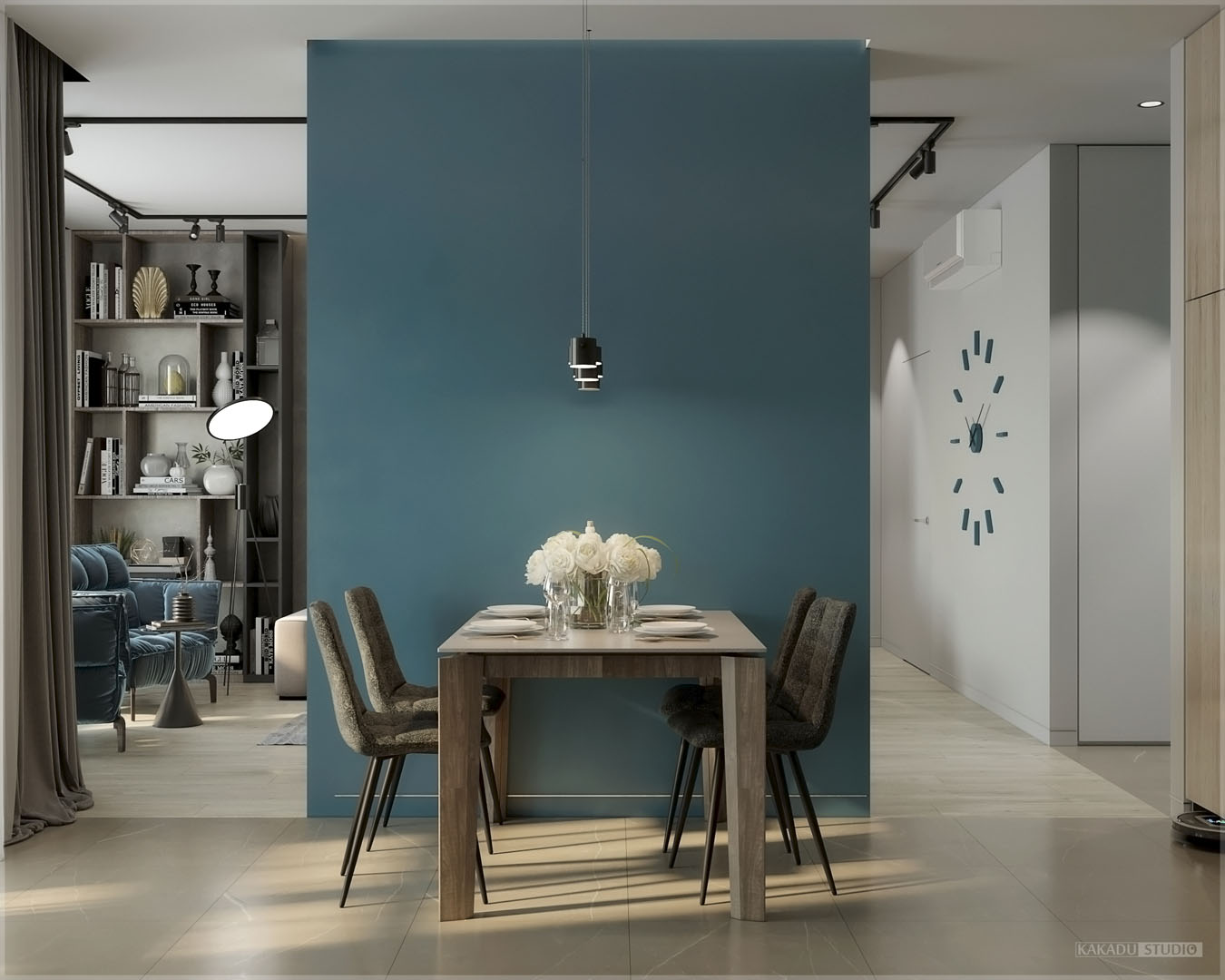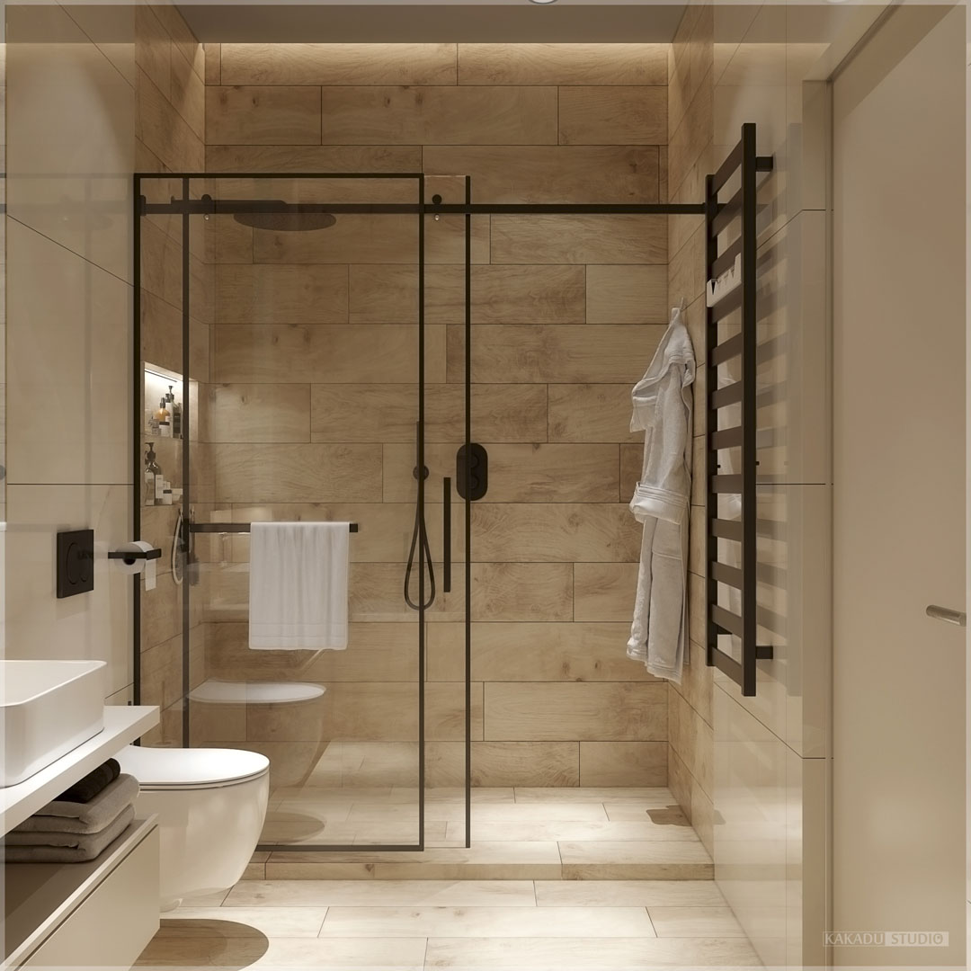 Сучасний стиль цієї квартири приваблює своєю соковитістю та водночас нейтральністю. Помешкання вийшли просторими та світлими. Серед приміщень є навіть кабінет, який також включає функцію вбиральні. Дуже зручним рішенням є санвузол сумісний з пральною.