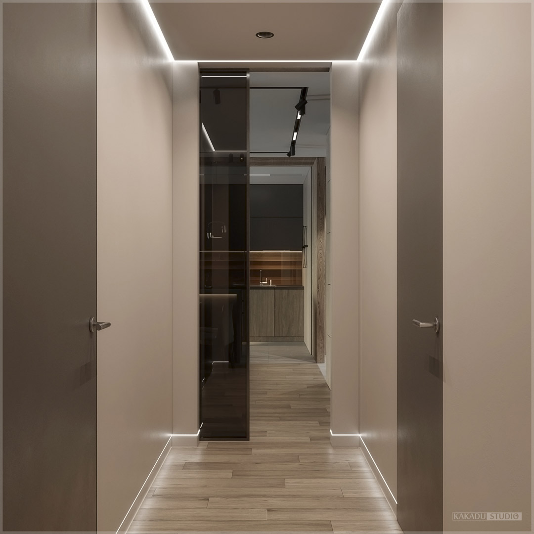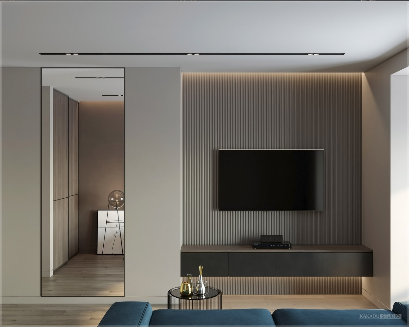 Поєднання красивих фактур каменю та дерева виглядає шикарно та дорого. Квартира має дуже зручне планування та чітке зонування на приватну та загальну зони. Простору студію ми бачимо вже зі входу, величезне дзеркало на всю стіну у вхідній зоні надає простору передпокою неймовірний об’єм.