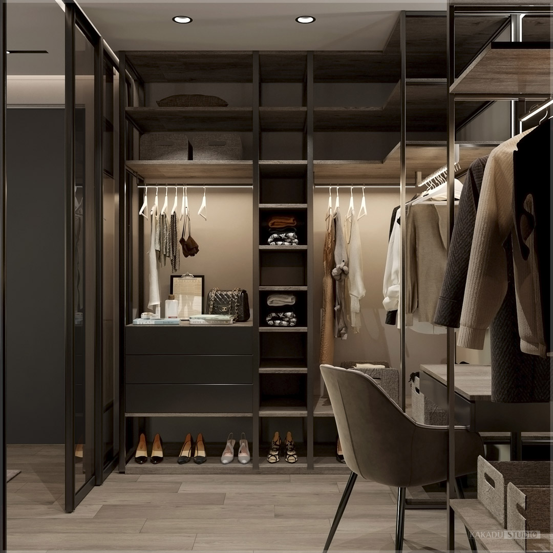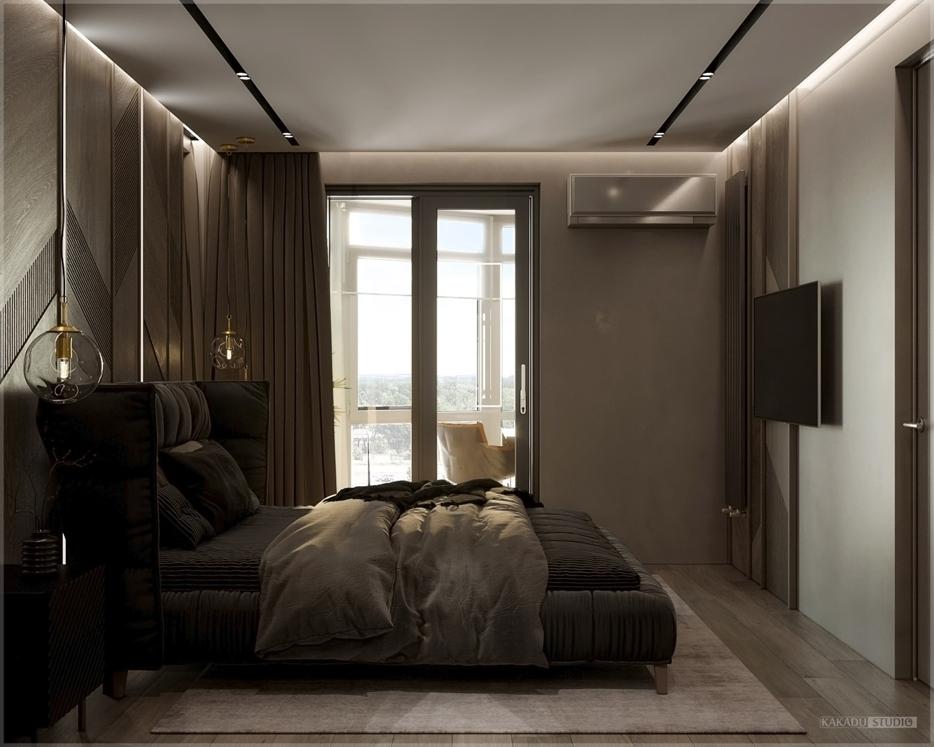 Досить насичений тон стін компенсується великою кількістю сучасного освітлення. Це і трекові світильники, декоративні бра, і підвіси.